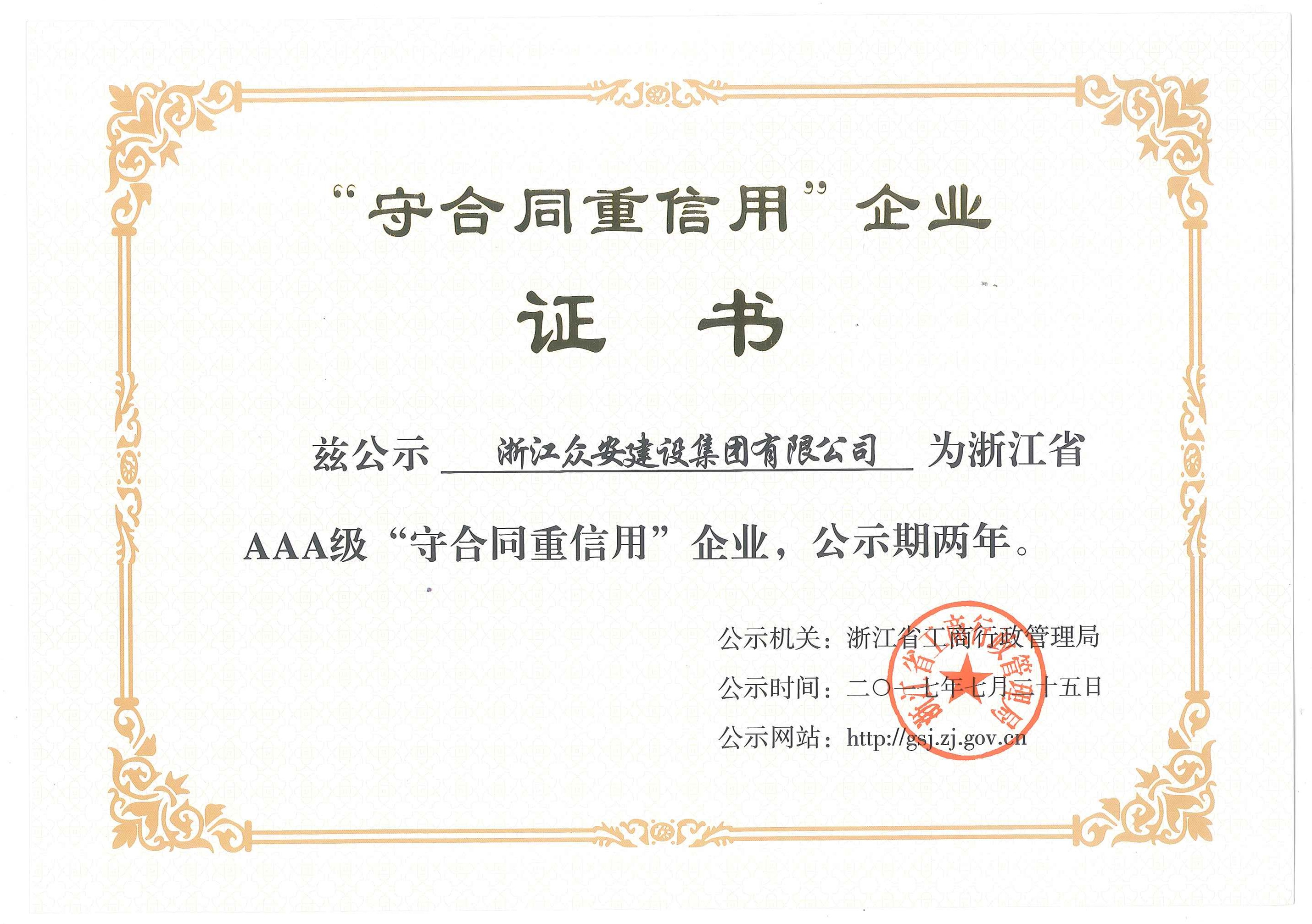 慶祝公司榮獲浙江省“AAA”級守合同重信用企業!