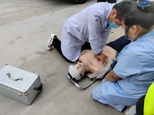 而后進行了高空墜落的演練,模擬泥工班組在登高砌筑時,不慎從操作架跌落導致頭部受傷,緊張有序地組織人員開始應急救援。城東醫院醫護人員駕駛急救車抵達出事點后,簡單包扎頭部后將傷員送往醫院救治。